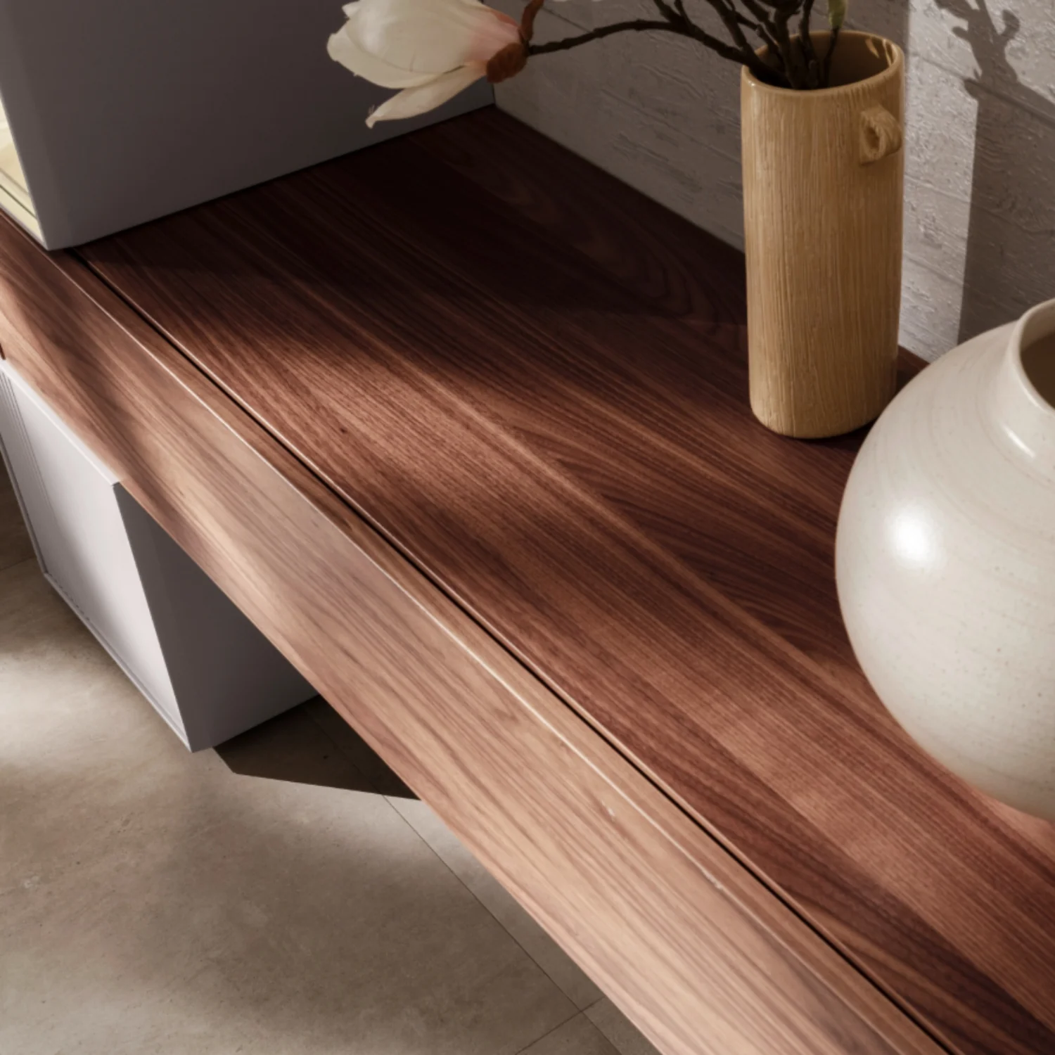 Die Wohnwand Colore besticht durch ihre durchdachten Details und eine hochwertige Verarbeitung. Das verwendete Holzwerkstoff-Material mit Nussbaumfurnier sorgt für eine warme, natürliche Ausstrahlung. Die Maße von 240 cm Breite, 45 cm Tiefe und 204 cm Höhe machen die Wohnwand zu einer großzügigen und dennoch platzsparenden Lösung für dein Zuhause.