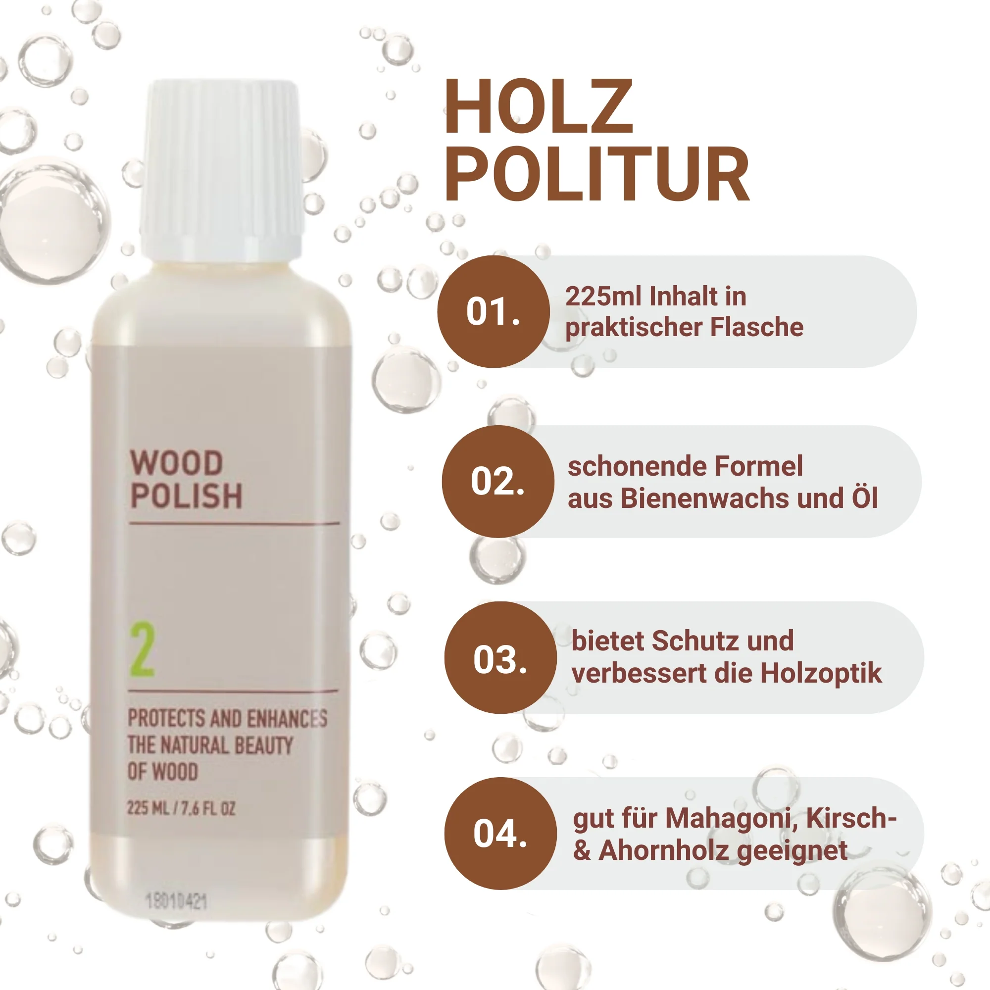 Holzpflege-Set Wood Care, 225ml Holzreiniger & Holzpolitur inkl. Reinigungstuch für Holzmöbel und Vertäfelungen