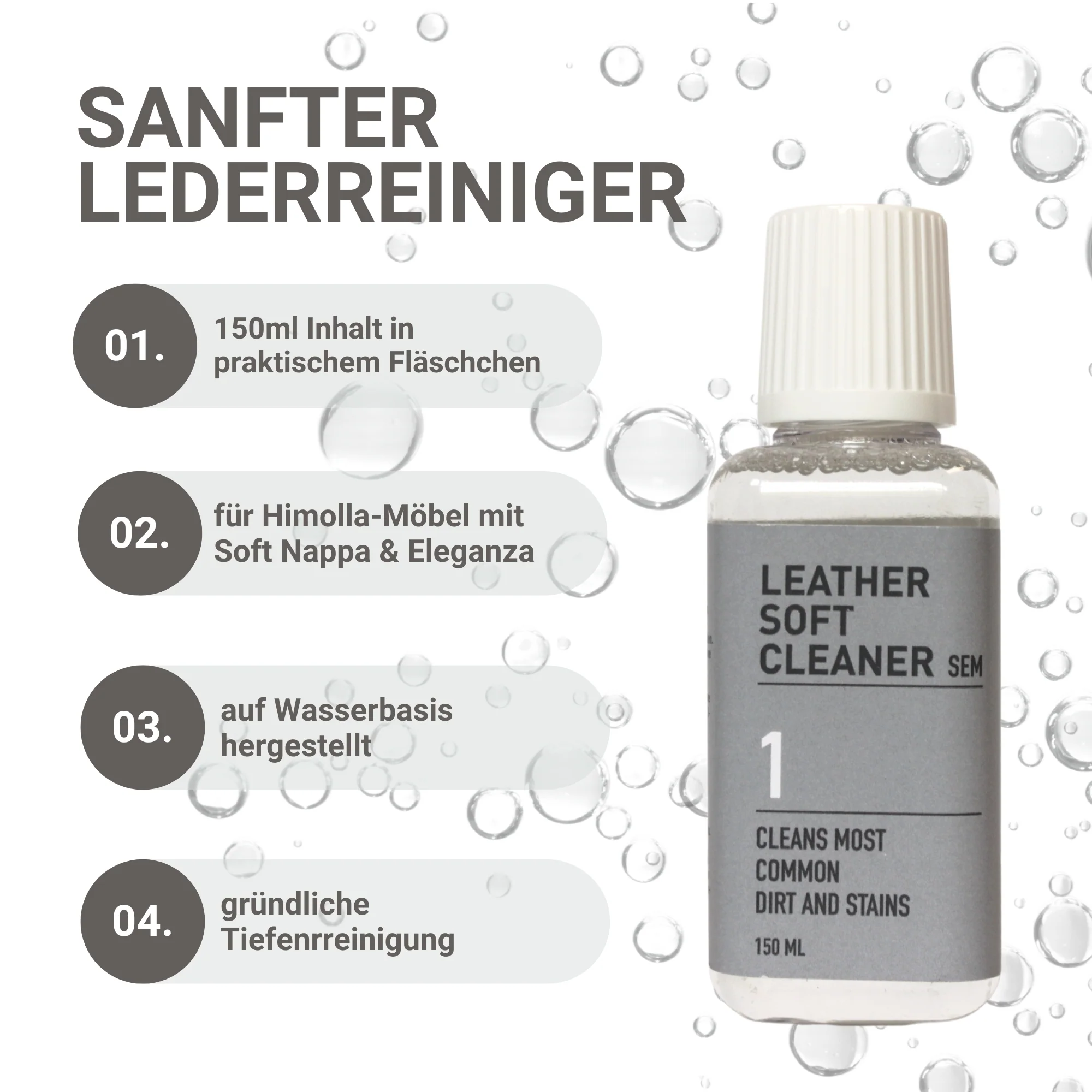 Mit dem SEM Leather Care-Pflegeset reinigen und schützen Sie optimal Ihre Himolla Möbel mit den Lederarten Soft Nappa, Eleganza . Der Lederreiniger (Leather Soft Cleaner) wird auf Wasserbasis hergestellt und dringt auch in kleine Poren des Leders ein um es schonend zu reinigen. Die Pflege-Creme (Leather Protection Cream) schützt Ihre Möbel vor Neuverschmutzungen wie Öl- oder Wasserflecken und anderen Abnutzungsspuren.